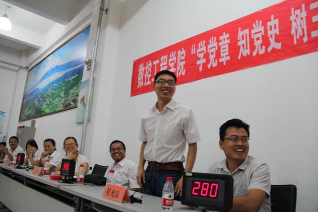 竞赛共分为必答题、抢答题、风险题与互动题四个环节,内容广泛,涉及党章、党史、抗战史,习近平总书记系列重要讲话精神,“三严三实”专题教育及校史、校情等多方面相关知识。选手分别来自数控学院各个部门的教师党员,分机电、数控、数维工设、教学办、学工办5个代表队。