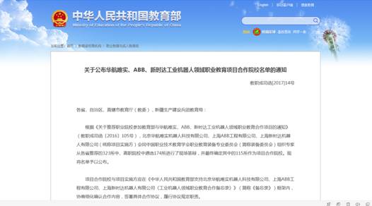 2月22日,教育部印发《关于公布华航唯实、ABB、新时达工业机器人领域职业教育项目合作院校名单的通知》(教职成司函[2017]14号),我院成功入选教育部工业机器人职业教育合作项目。