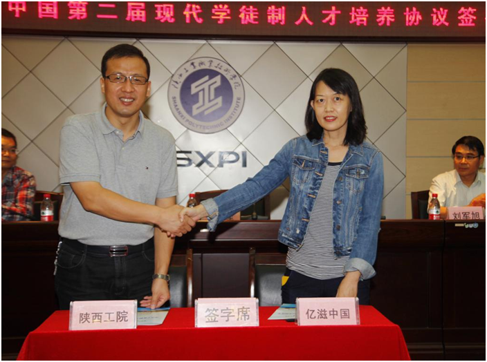 9月28日上午,我院与亿滋中国第二届“现代学徒制”亿滋班开班仪式在崇文南楼十楼第五会议室举行,亿滋中国亿滋iTech项目负责人、高级人事经理佟晓琳与副院长杨卫军签定了《陕西工院/亿滋中国“现代学徒制”人才培养协议书》。亿滋北京、亿滋苏州各公司人事、生产主管,学院校企处副处长王化冰,学生处副处长张科海,教务处副处长刘军旭,数控学院党总支书记郝军、院长刘清及亿滋班全体学员参加了仪式,数控学院院长刘清主持仪式。