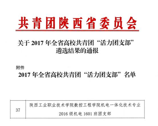 为积极落实团省委“活力团支部”创建遴选活动,我院数控工程学院机电1601班团支部积极参与“活力团支部”申请工作,经过校内创建、省级遴选等程序,最终获得2017年全省高校共青团“活力团支部”称号。