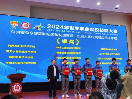 10月27日-11月1日,2024年世界职业院校技能大赛总决赛争夺赛高职组“机器人系统集成应用技术”赛项在山东职业学院举行。本次大赛共有全国各地60支队伍参赛,经过2天激烈的角逐,我校航空工程学院王晨、桓茜老师指导的孙豪哲、高子晨、李武岳、孔梦源四位选手,以优异成绩获得该赛项的银奖。