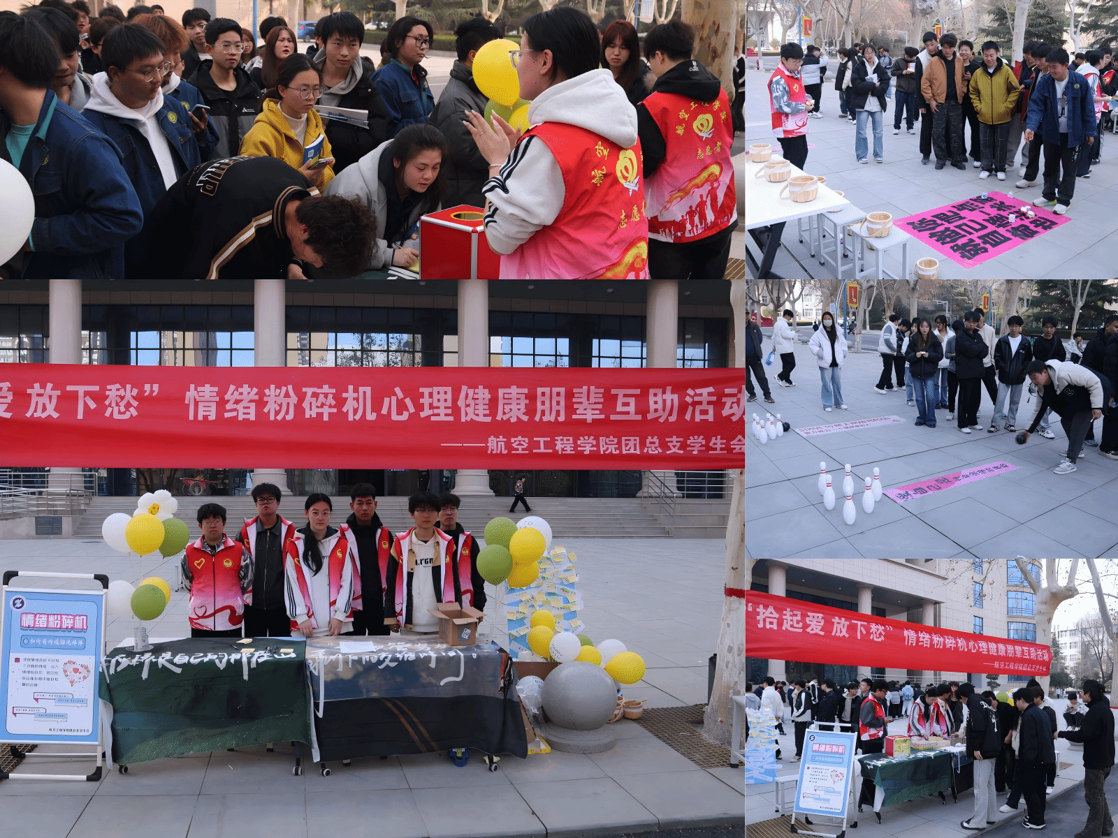 为积极回应大学生日益增长的心理健康需求,切实发挥学生会组织服务同学的桥梁纽带作用,2月26日下午,一场别开生面、充满创意与温情的“拾起爱,放下愁”情绪粉碎机心理健康朋辈互助活动在我校成才大道精艺楼前火热举行。本次活动由航空工程学院学生会精心策划组织,旨在通过创新互动形式,帮助同学们有效释放压力、疏导不良情绪,提升心理韧性,引领校园情绪管理新风尚,营造积极阳光的校园氛围。